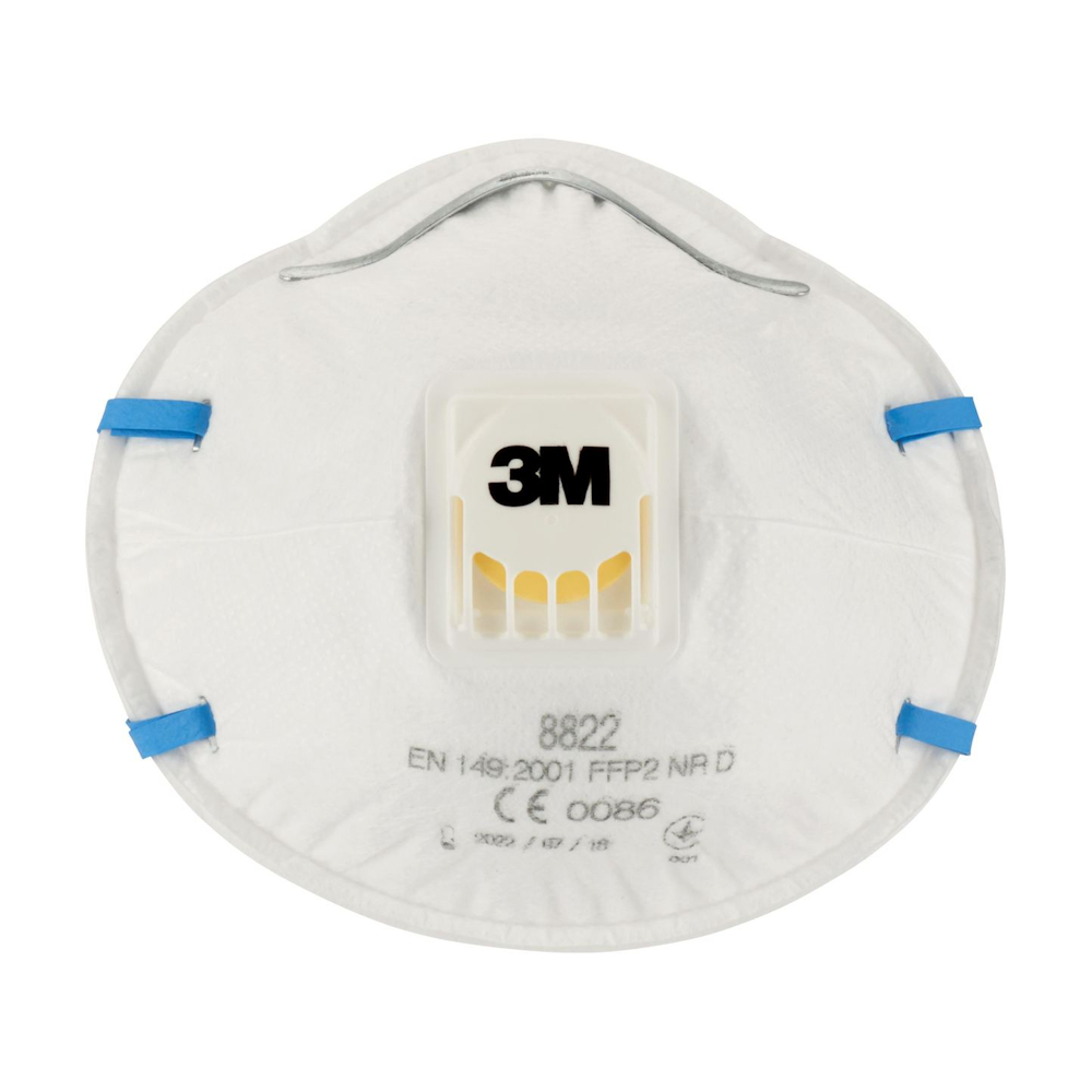 3M 8822 filtrerende halvmaske, ventilklasse P2. Den unikke ventil og de formbevarende skaller giver holdbar og komfortabel beskyttelse, især under varme og fugtige forhold. Den patenterede Cool Flow udåndingsventil letter udåndingen og gør det mere behageligt at bruge beskyttelsen, da varme og fugt fra den udåndede luft ledes ud. Traditionel kopformet model med konveks form, næsebro og to stropper. Komfortabel, let konstruktion, der ikke ligger mod ansigtet. Pålidelig, effektiv beskyttelse mod støv og partikler. Holdbar, formbevarende inderskal. Klassificering: SS-EN 149+A1:2009 FFP2 NR D. Beskyttelsesfaktor 10.