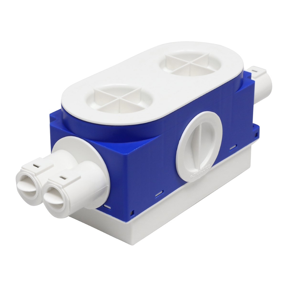 Modulsystemet kan kombineres, som du ønsker. Med et udvalg af tilbehør er der en løsning til alt! Den patenterede Twist-låsning af forbindelser og tilbehør muliggør tilslutning af rør op til 50 mm til boksene! Standardforbindelser, der medfølger boksene, er altid til både 16 og 20 mm rør. Forbindelserne er udstyret med låseplader i rustfrit stål og tætningspropper med håndtag. Håndtaget eliminerer behovet for værktøj ved afmontering. Fås som enkeltbokse, 1,5 bokse og dobbeltbokse. Alle bokse leveres med gipsafdækning. Fremstillet af halogenfri plast, der er genanvendelig og miljøvenlig.