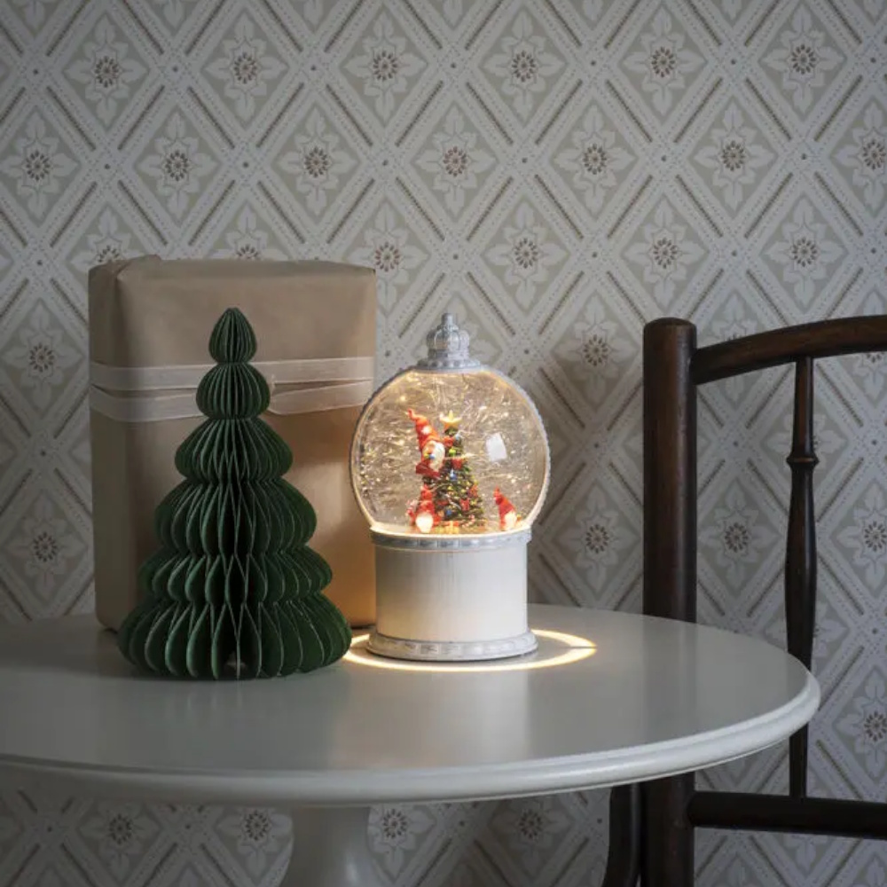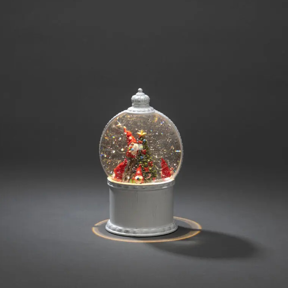 Snekugle med 4 julemænd og roterende funktion. Hvirvlende glitter, varm hvid LED og 5-timers timer. Drevet af 3xAA-batterier (medfølger ikke) eller USB. Inklusive 1,8 m USB-kabel.