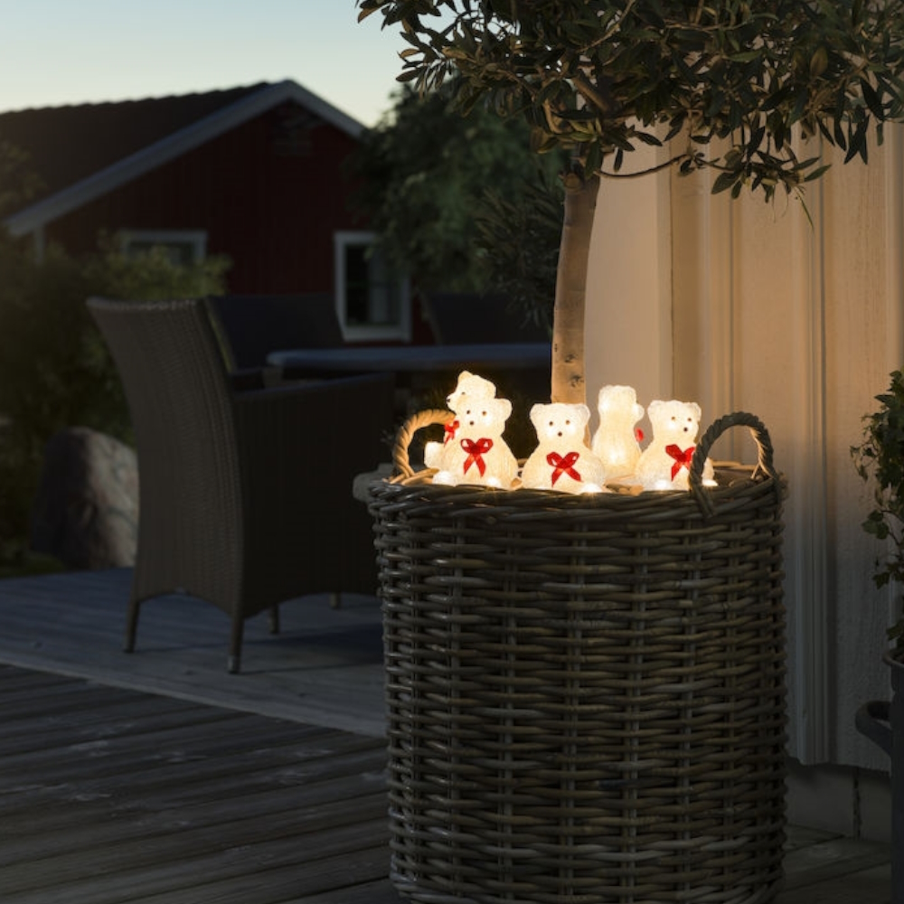 Lad disse fem søde bamser sprede deres bløde glød over haven eller altanen. Lyskæden er lavet af slidstærk akrylplast og oplyst med 40 varmhvide LED-lys - perfekt til både indendørs og udendørs brug. Med en meter mellem hver bamser har lyset masser af plads til at funkle, og den diskrete, transparente ledning passer flot ind i omgivelserne. En fantastisk dekoration, der er sikkert drevet af en 24V transformer.