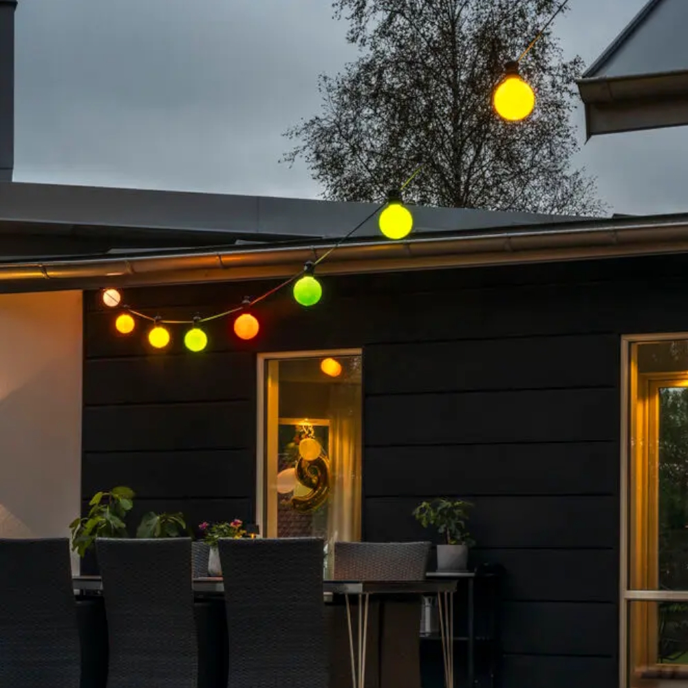 Farverig festkæde med lidt større kupler og batteriboks med solceller. Perfekt til steder, hvor der ikke er en stikkontakt. 10 pastelfarvede kupler og varm hvid udskiftelige LED'er. Inklusive solpanel og batteriboks, fjernbetjening med timer 4/6/8 timer. Lysdæmper, sensor og multifunktion. Jordspyd og 1,8 m USB-kabel medfølger. Lampens afstand er 50 centimeter. Forbindelseskablet er 10 meter langt, hvilket giver en samlet længde på 14,5 meter.