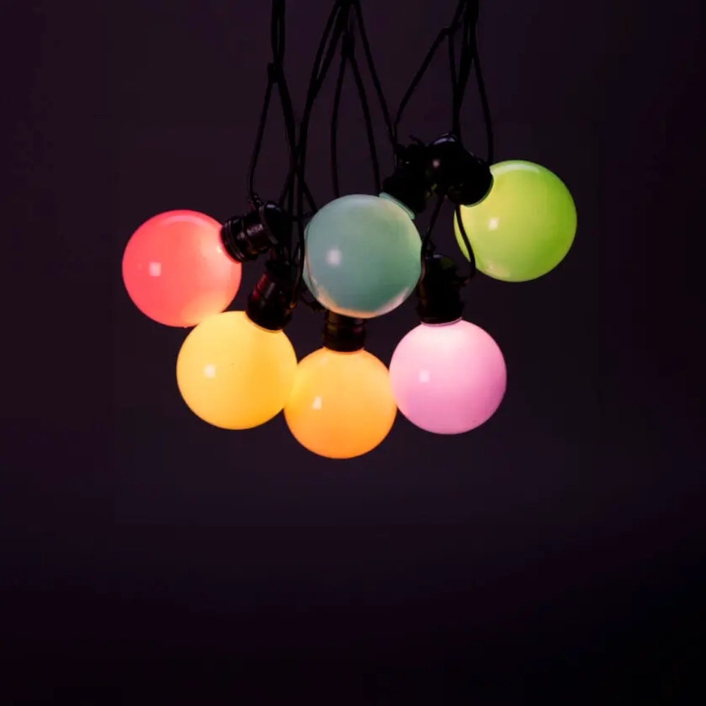 Farverig festkæde med lidt større kupler og batteriboks med solceller, 10 pastelfarvede kupler og varm hvid udskiftelige LED'er.