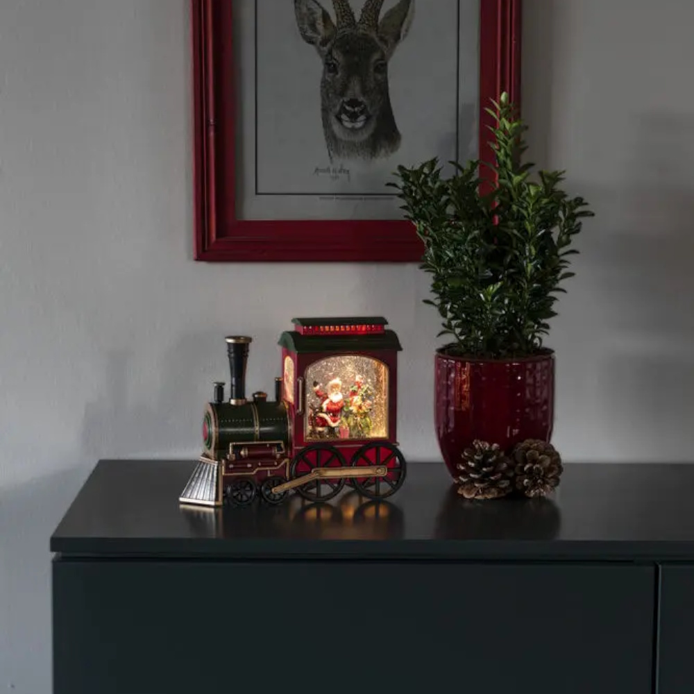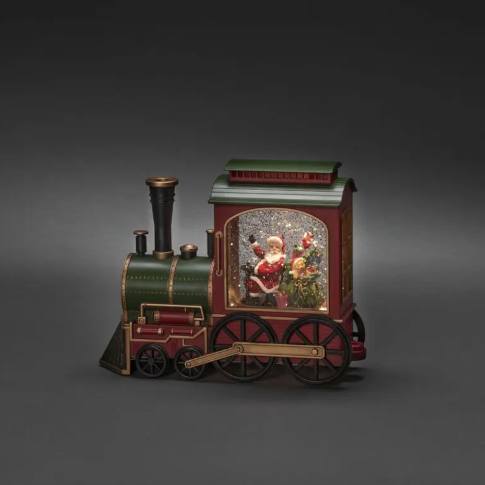 Hjemmelig, vandfyldt juledekoration formet som et tog med julemanden. Glimmeret hvirvler rundt som i en snekugle og skaber en magisk julestemning. Varmhvid LED-belysning og udstyret med en praktisk 5-timers timer og mulighed for både batteridrift og USB-tilslutning for nem placering.