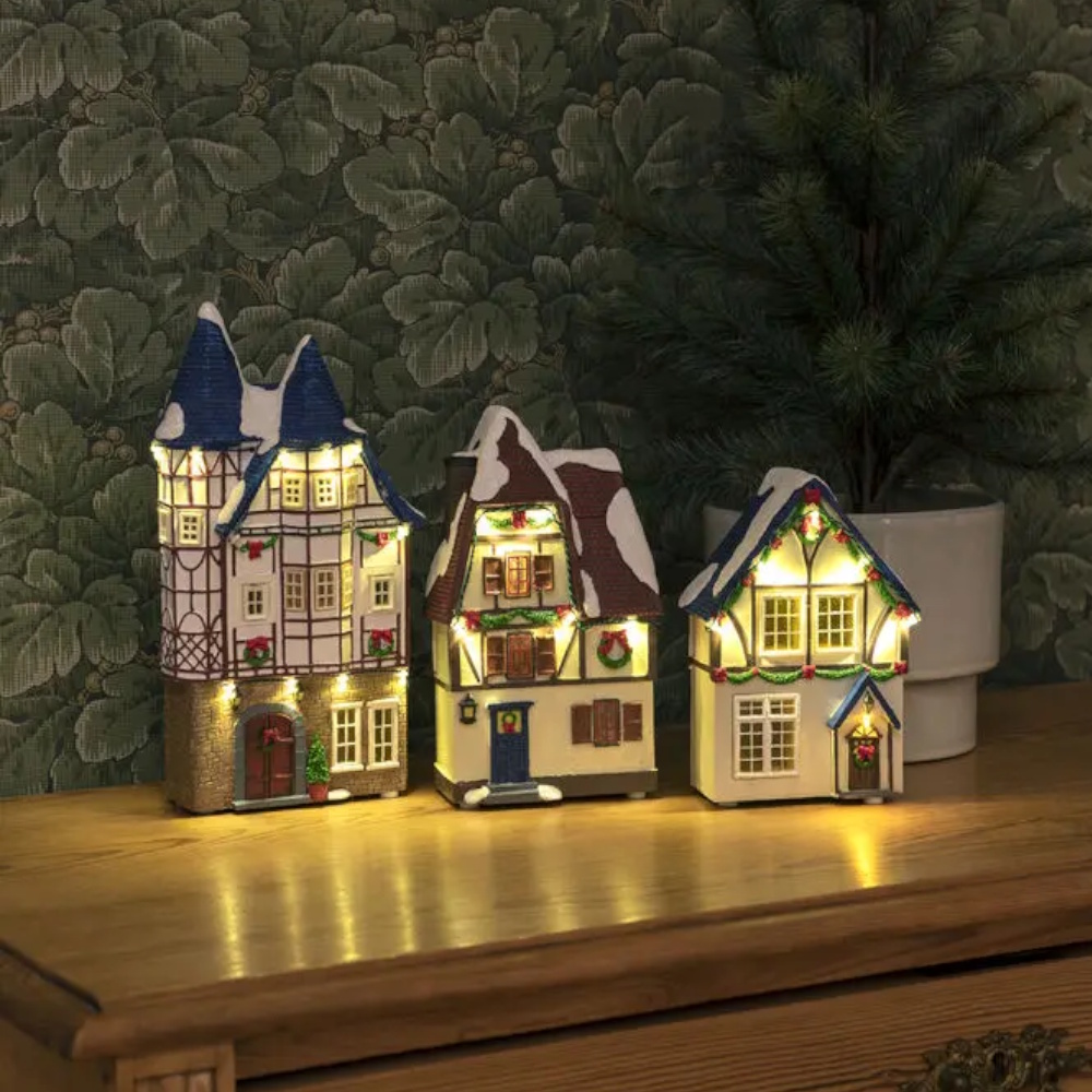 3 små separate huse med varm hvid LED og 6 timers timer. Byg din egen julelandsby. Drevet af 6xAAA-batterier og USB. Inklusive 3x1,8m USB-kabel. Ekskl. batterier.