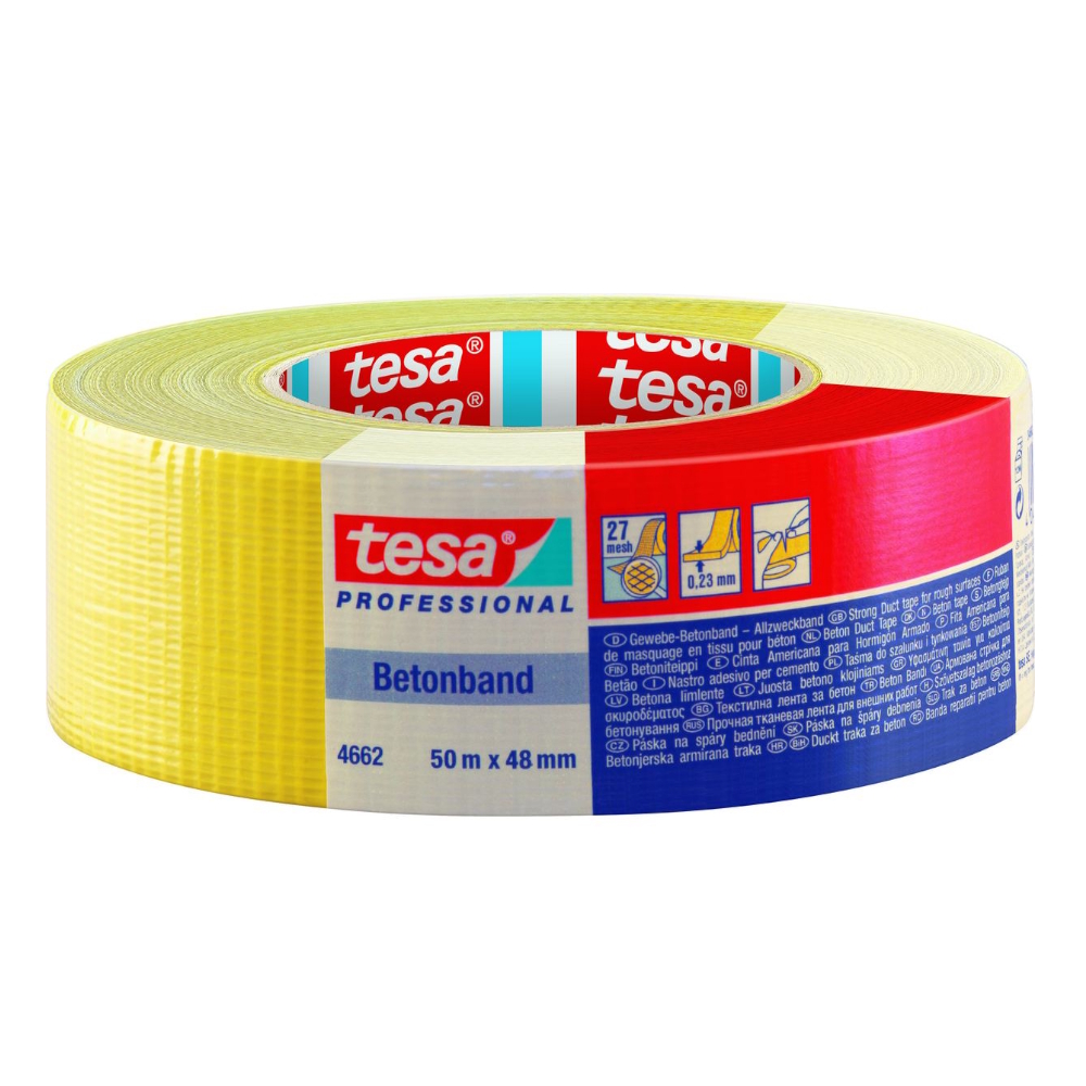 Betonbånd Stærk vævet bånd Tesa. En stærk UV-bestandig betonbånd. Den består af en bærer af vævet PET/bomuldsstof i 27 mesh belagt med naturgummilim. Maskering på ru, let støvede overflader. Forskalling til beton (kontrastgul). Primært til udendørs brug. Til fastgørelse af byggefolie. Monteringstape i byggebranchen. Tætning af klimaanlægskanaler, rør og ventilationsskakte (indendørs). UV-bestandighed 2 uger.