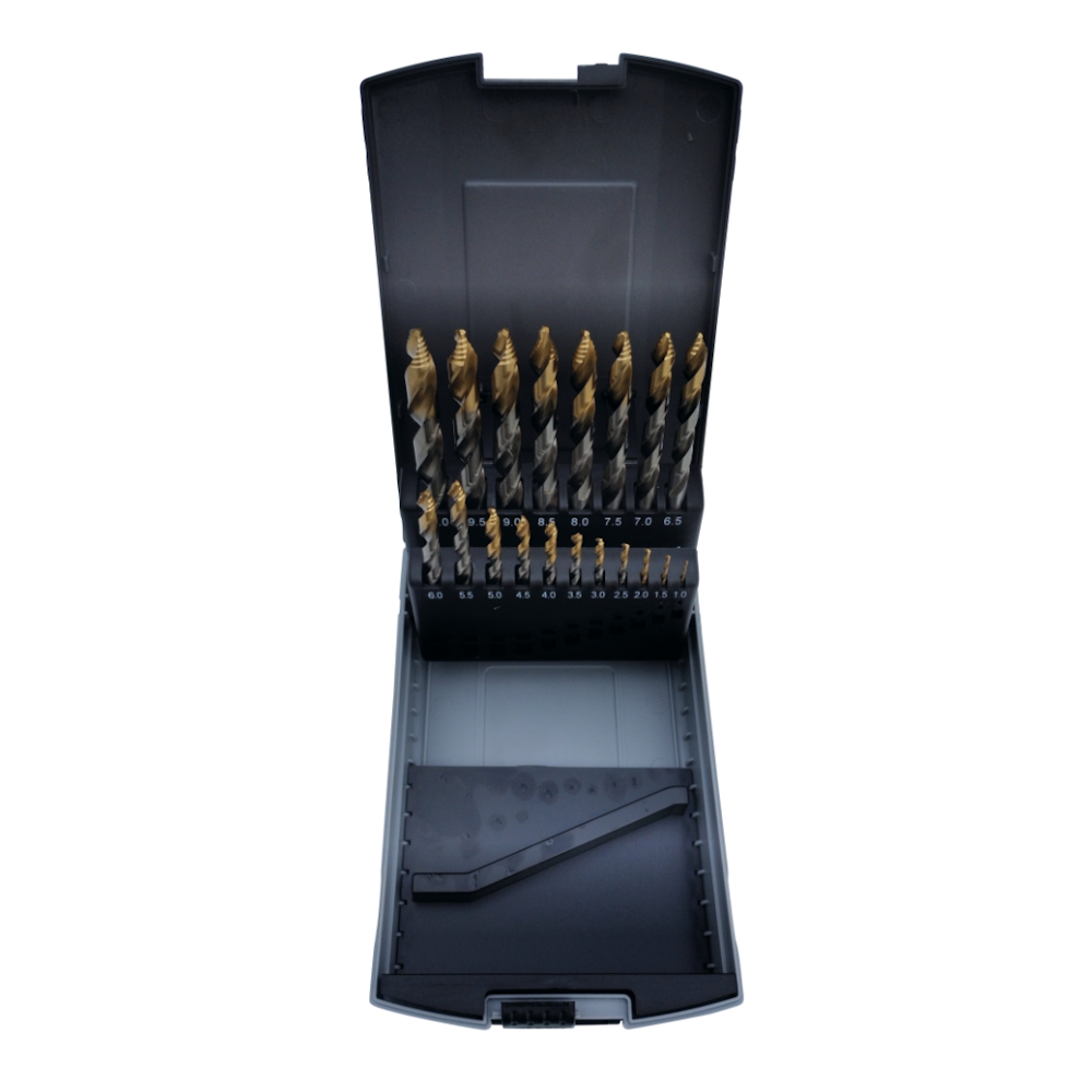 Borekassette i æske med 19 krydsslebne bor med trinspids 1-10 mm / 0,5 mm stigning.