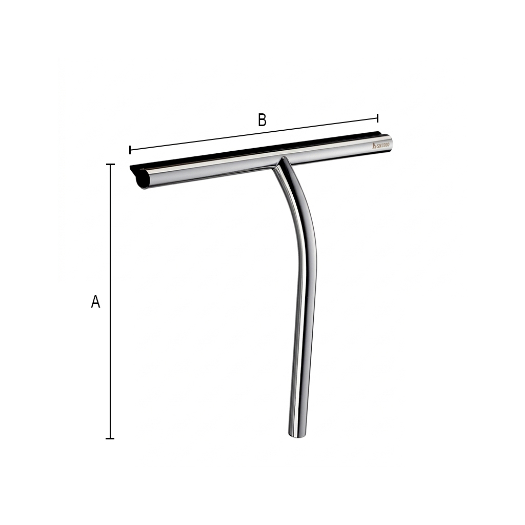 Stilfuld bruseskraber. Den er lavet af rustfrit stål med en forkromet, skinnende overflade og et sort silikoneblad.