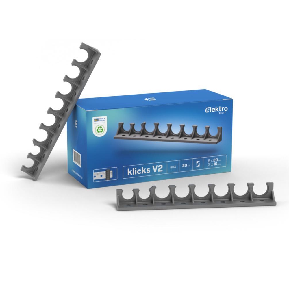 Strømline din rørlægning med Clicks. Spænd nemt op til 7 fleksible rør med blot et par skruer. Ved hjælp af Clicks bliver installationen hurtigere, nemmere og smukkere. Perfekt til når du trækker flere rør i bredden. UV-bestandig og halogenfri. Clicks 20mm indeholder 6x20mm og 2x16mm beslag.