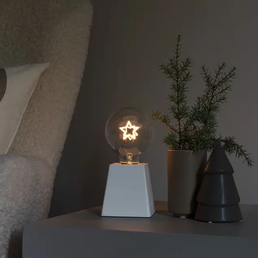 Dekorativ belysning med hvidlakeret træbase, ravfarvet LED-lampe formet som en stjerne, E27-fatning.