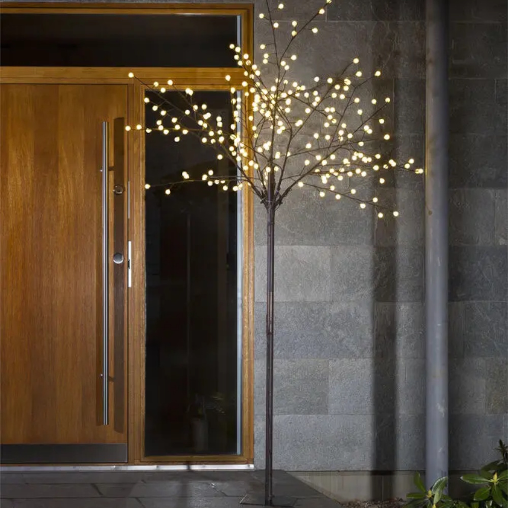 Naturtro dekorativt træ med brune grene og 240 varm hvide LED-kirsebærpærer, der spreder en atmosfærisk glød. Træet er 250 cm højt, har en robust metalramme med en stabil base og passer lige godt udendørs som indendørs.