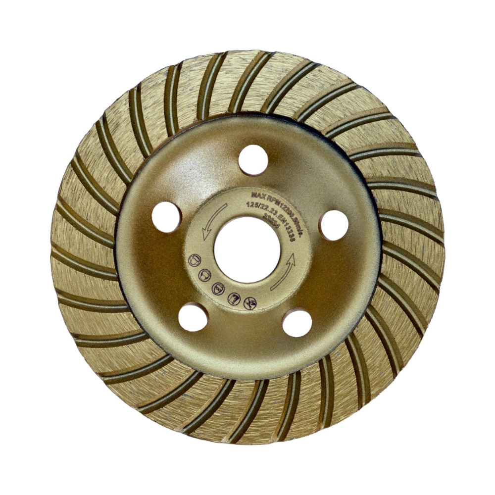 Diamantslibekop til slibning, formning og polering af forskellige særligt hårde materialer såsom byggematerialer, betonoverflader, fliser, mursten, sten og keramik. Indeholder diamantkorn, der giver effektiv slibning og lang levetid. Turbo betyder et specielt design, der har en forbedret kølestrøm og mindre modstand under slibning. Dette gør, at slibekoppen arbejder mere effektivt og afleder varme effektivt, hvilket giver en bedre overfladefinish. Turboskiver er designet til brug på hårde materialer såsom beton og natursten.