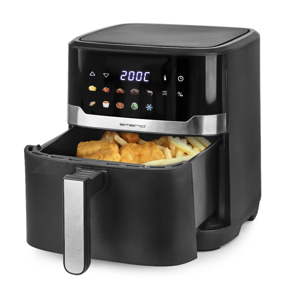 Denne smarte, digitale varmluftfrituregryde gør maden dejlig sprød uden behov for at tilsætte olie. Juster temperaturen, indstil timeren, og vent på, at frituregryden signalerer, at maden er klar. Nemt, hurtigt og bekvemt får du maden perfekt stegt til hele familien. Emerios digitale varmluftfrituregryde har et stilfuldt design og et digitalt farvedisplay, der nemt justerer temperatur- og timerindstillingerne for perfekt tilberedt mad. Det indbyggede signal fortæller dig, hvornår maden er klar. Der er også forudindstillede programmer til forskellige ingredienser, der gør det nemt at tilberede maden. Frituregryden har gummifødder for stabil placering, dele, der kan vaskes i opvaskemaskinen, og en aftagelig kurv. Denne digitale varmluftfrituregryde med en kapacitet på 6,5 liter steger nemt og hurtigt pommes frites til 6-7 personer.