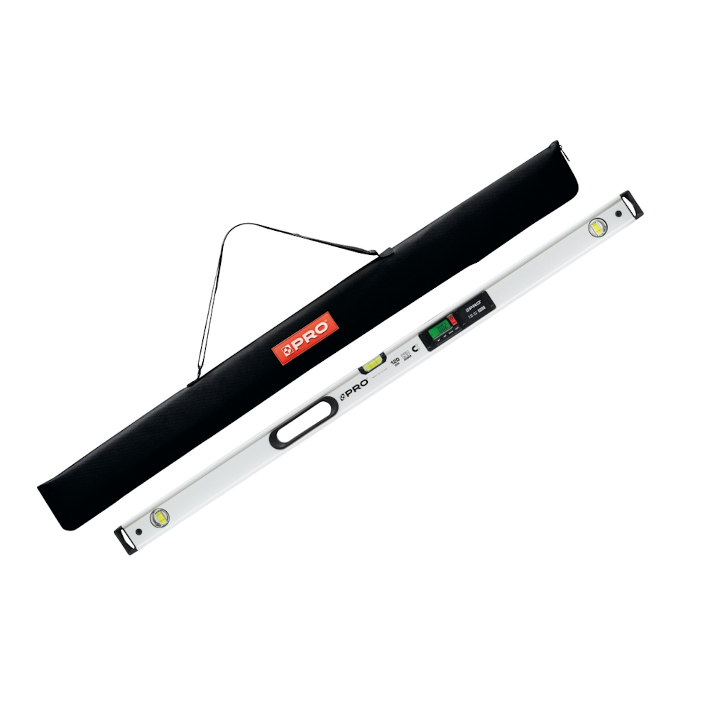 PRO digital vaterpas er et ekstra stærkt digitalt professionelt vaterpas. IP65-klassificeret i trekammer aluminiumsprofil med dobbelte klart oplyste LCD-displays samt stærke neodymmagneter og aftagelige gummibelagte stødabsorberende endestykker. Beregnet til daglig brug i byggeri og industri, der stiller høje krav til pålidelighed og holdbarhed. De to digitale LCD-vinduer er oplyst med baggrundsbelysning for klar og hurtig aflæsning, selv i dårligt lys. Tallene i displayet roterer automatisk 180°, så du altid aflæser den rigtige vej opad og ikke på hovedet. Hurtig justerbar i alle vinkler i både procent, grader og mm pr. meter. Holdefunktion for enhver indstillet vinkel. Hukommelsesknap, der holder 19 målinger i hukommelsen. Udsender klare lydsignaler ved 0° / 30° / 45° / 60° og 90°. Enkel kalibreringsfunktion. Referencevinkel (falsk nul) til overførsel af den målte vinkel. 2 batterier (inkluderet) og batteriindikator. Store, klare silikoneknapper, der er nemme at bruge, selv med handsker. IP65-klassificeret og godkendt. 1 vaterpas og 1 lodboble.