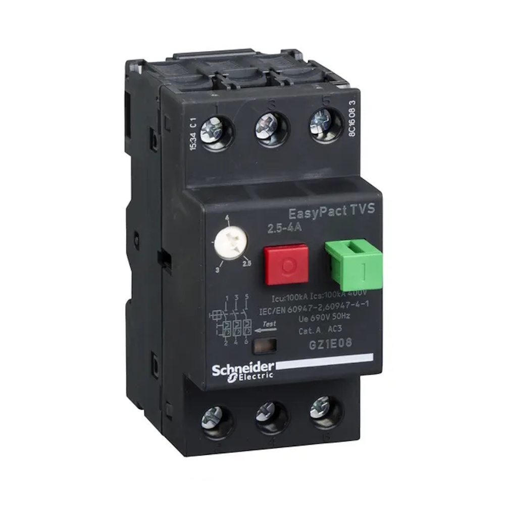 GZ1 E er 3-polede 3d termisk-magnetiske afbrydere specielt designet til styring og beskyttelse af motorer i overensstemmelse med standarderne IEC 60947-2 og IEC 60947-4-1. Indstillingsområde for termiske udløsninger er 2,5-4A med termomagnetisk udløsningsenhed. Det giver IP 41 i GV2 MC01 kabinet og IP 55 i GV2 MC02 kabinet beskyttelse. Det giver standard pålidelighed og holdbarhed med 0,1 Mcycles elektrisk/mekanisk holdbarhed. Disse afbrydere er designet til tilslutning med skrueklemmer. Tilgængelig over hele verden er den multi-standard certificeret (IEC, UL, CSA, CCC, EAC, Marine) og Green Premium-kompatibel (RoHs/Reach).