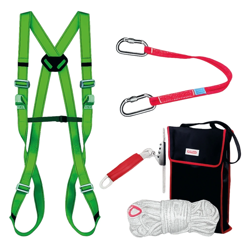 - Komponenter: Indeholder sele, faldhæmmende line, glidelås og reb.