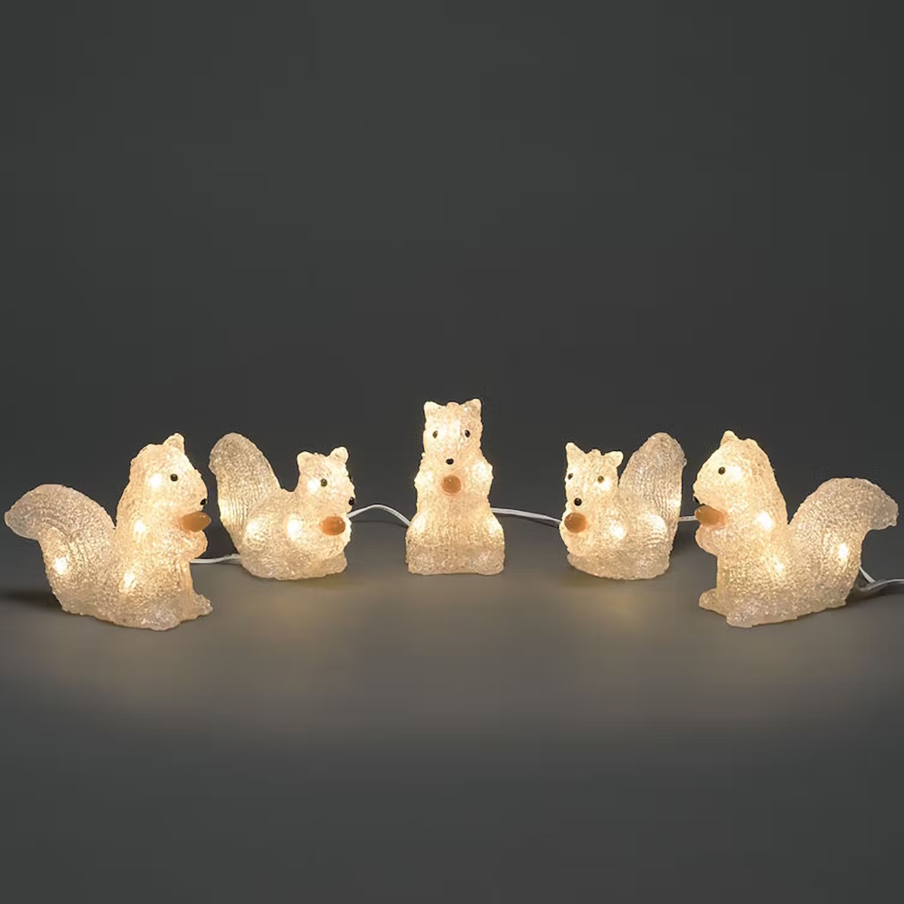 Lad disse fem søde egern sprede deres bløde glød over haven eller altanen. Lyskæden er lavet af slidstærk akrylplast og oplyst med 40 varmt hvide LED-lys - perfekt til både indendørs og udendørs brug. Med en meter mellem hvert egern har lyset masser af plads til at funkle, og den diskrete, transparente ledning passer flot ind i omgivelserne. En fantastisk dekoration, der drives sikkert med en 24V transformer.