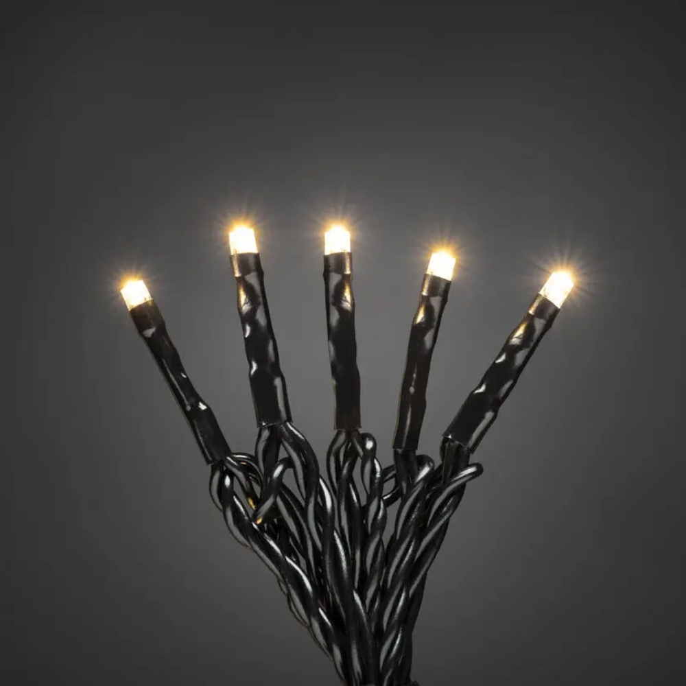 Ekstra sløjfe med 100 varm hvide mikro-LED-lys, blødt kabel. Lampeafstand 10 cm. Forbindelseskablet er 5 meter, hvilket giver en samlet længde på 14,9 meter. Maks. 4 sløjfer pr. transformer (startsæt + 3 ekstra sløjfer).