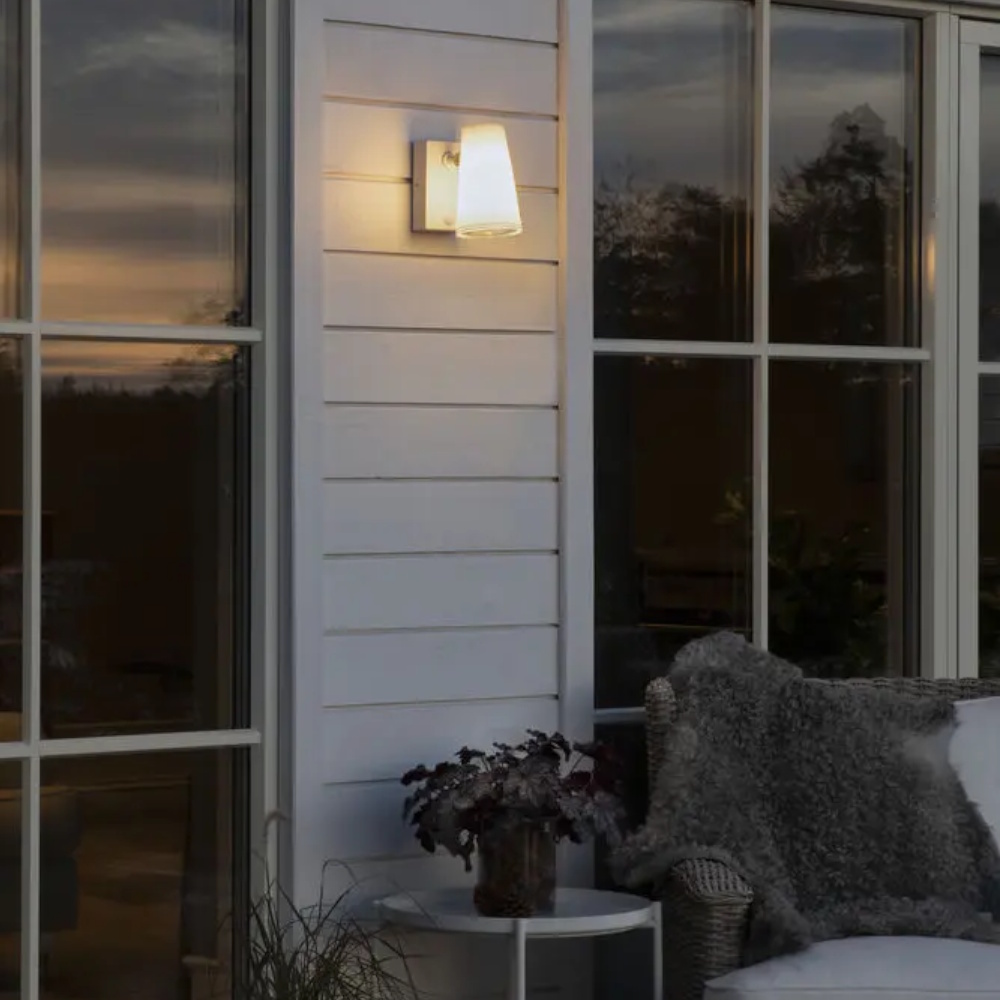 Fano facadebelysning er en stilfuld væglampe i hvidlakeret aluminium med en skærm i opal akrylglas. Skærmen kan rettes sidelæns og opad. Udstyret med bevægelsessensor. E27-fatning til lyskilde på maks. 25W (Lyskilde medfølger ikke).