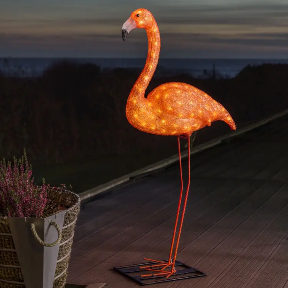 Flamingo i slidstærk akrylplast med 96 slidstærke LED-lys. Velegnet til både indendørs og udendørs brug. Drevet af en 24V transformer og har en 5 meter tilslutningsledning. Højde 110 cm.