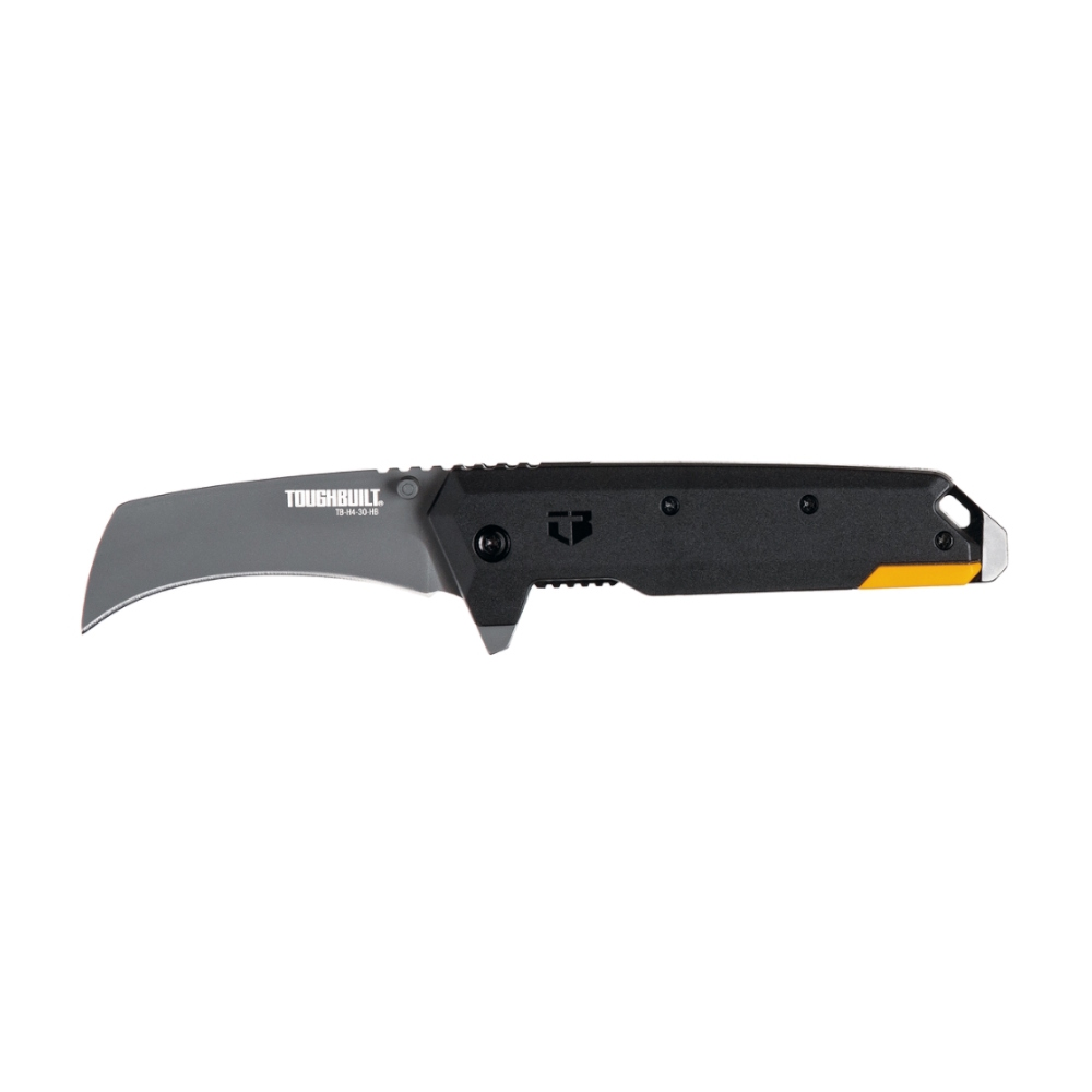 ToughBuilt Hawkbill Heavy Duty foldekniv med sort, buet klinge i rustfrit stål er designet til optimal skarphed og holdbarhed over lang tid. Det titaniumbelagte, let buede blad i rustfrit stål er designet til at holde sig skarpt op til dobbelt så længe sammenlignet med et almindeligt knivblad i rustfrit stål. En solid metaltang, der løber gennem hele håndtaget, giver styrke og lang holdbarhed til hårde skud hver dag. Bladet er fjederbelastet og foldes hurtigt og nemt ud med én hånd via tommelfingerknappen eller "flip"-bevægelsen. Ergonomisk formet, aflastende, skruet ABS/nylon-håndtag med pegefingerafskæring. Integreret bræk- og skrabeværktøj i bagkanten af håndtaget. Metalbælteklips for sikker fastgørelse.