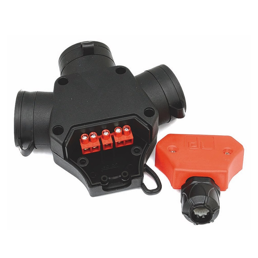 3-vejs forgreningsdåse med dæksel og ophængsbeslag. Fås i både 1-faset og 3-faset version, hvor hver Schuko-stikdåse er tilsluttet sin egen fase for jævn belastning. Nem tilslutning til klemrække.