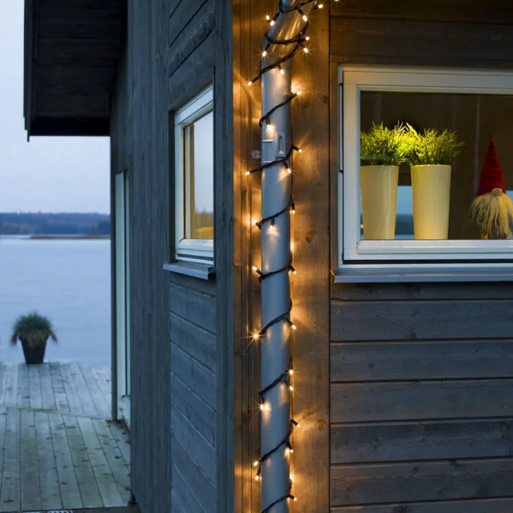Forlængerløkke med 100 ravfarvede LED'er til udendørs brug. Sort robust blødt kabel. Drevet af en 31V transformer med indbygget lysdæmper. Forbindelseskablet er 10,20 m. Systemet kan udvides til 1200 LED-lamper eller 120 m.