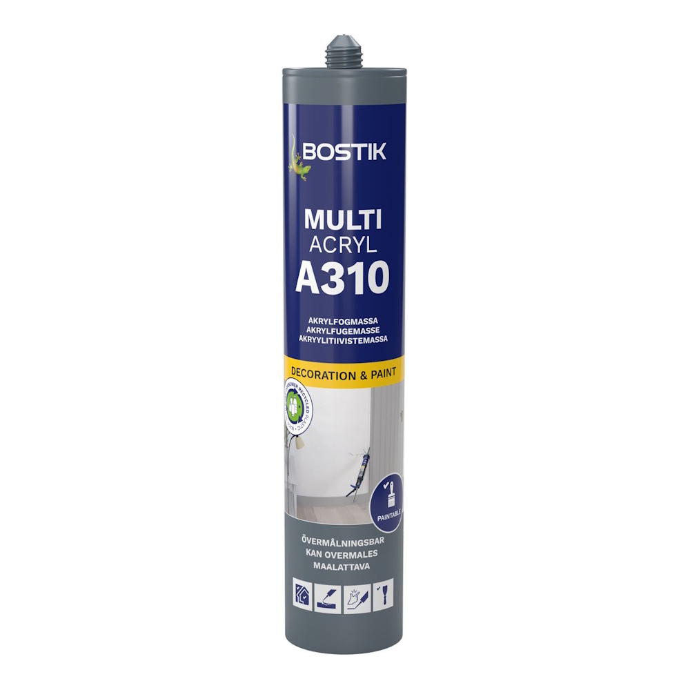 Højkvalitets og ftalatfri fugemasse, der giver perfekt vedhæftning uden primer. Bostik A310 Multi Acrylic kan overmales med vandbaserede og syntetiske malinger. Efter at vandet er fordampet fra den påførte fugemasse, hærder den til plastisk-elastisk gummi.
