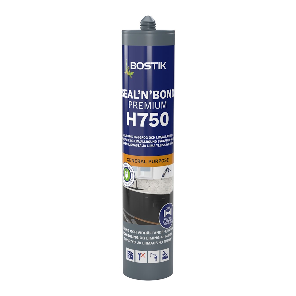 Bostik H750 Seal 'N' Bond Premium er specielt designet til at skabe holdbare og elastiske samlinger i de fleste byggede miljøer som køkkener, badeværelser, brusere og industrimiljøer med varierende underlag og høje sikkerhedskrav. Fugemassen har en meget høj modstandsdygtighed over for UV-stråling, vejr og vand og er praktisk talt lugtfri.