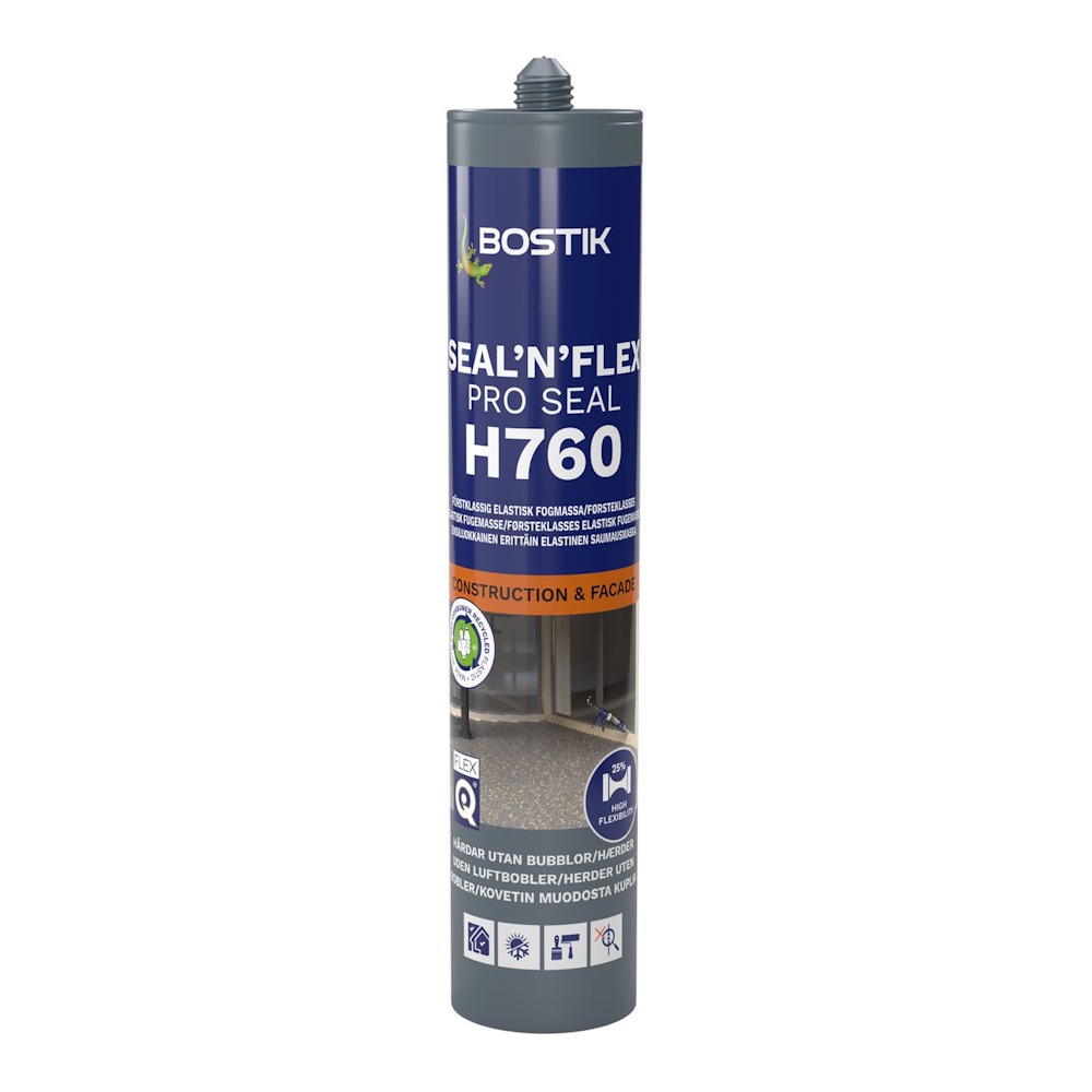 Bostik H760 Seal’n’flex Pro Seal er specielt designet som en universalfugemasse til konstruktions- og dilatationsfuger, i facader, forbindelses- og dilatationsfuger samt fuger på gulvoverflader eller gangarealer. Den elastiske fugemasse krymper ikke og hærder uden bobler. Til indendørs og udendørs brug.