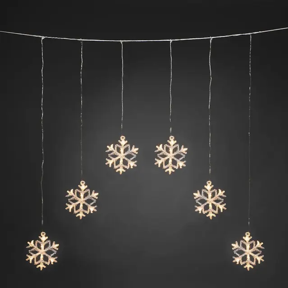Dette lysgardin til udendørs brug har 6 varme hvide snefnug og i alt 48 LED'er, der spreder en varm glød. [Energiklass F]