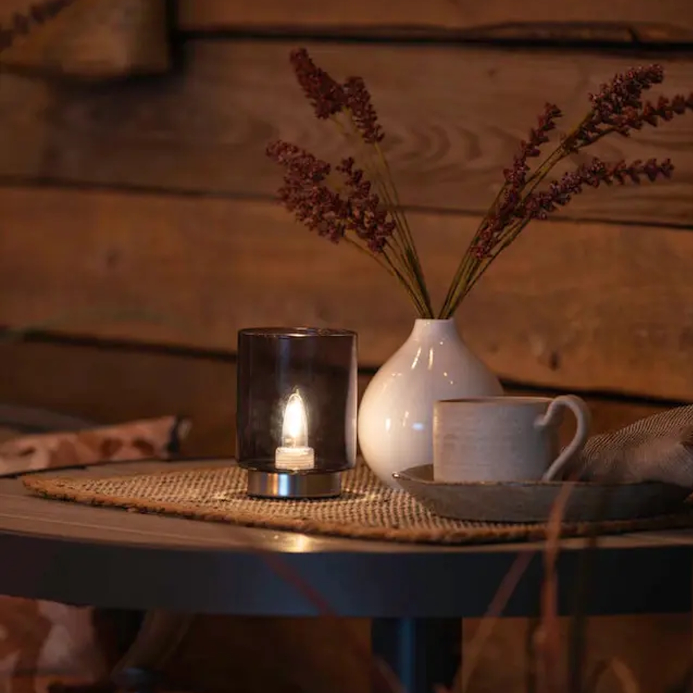 Genopladelig lyslanterne med varm, levende glød (2200K) og indbygget lysdæmper. Røget, gråt glas og sølvfarvet base. Borddekoration med trådløs frihed - nemt at oplade via USB. Skaber en hyggelig atmosfære på middagsbordet, i vinduet eller på receptionsdisken. Udskiftelig LED-pære. 1,8m USB-kabel medfølger.