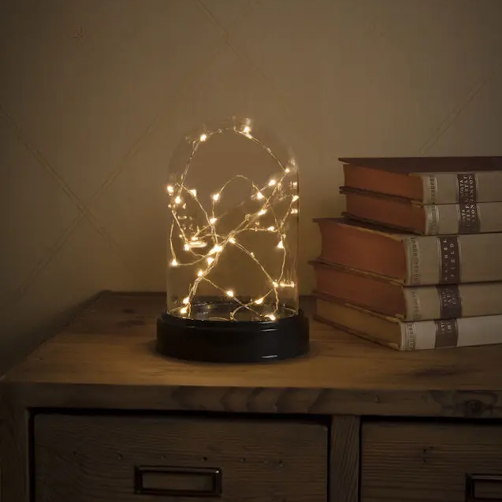 Glaskuppel med en løkke, der har 30stk ravfarvede LED'er. Løkken drives af 3xAA-batterier (medfølger ikke), har en timerfunktion på 6 timer.