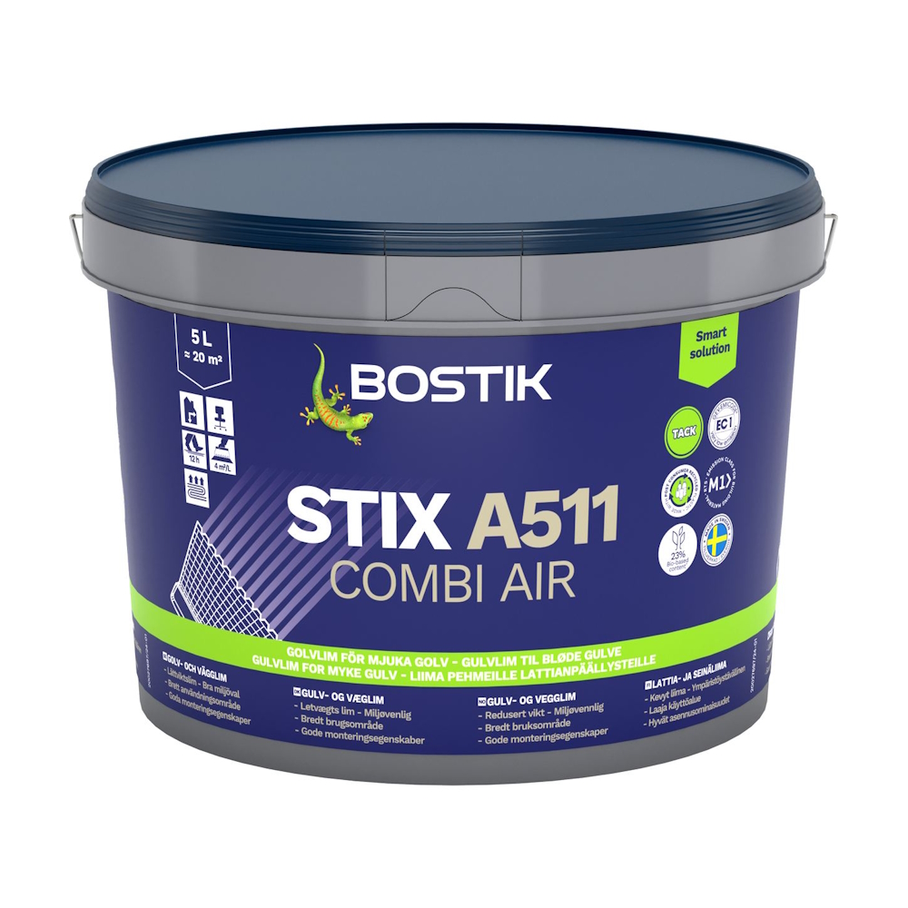 Vandbaseret gulv- og vægklæber, der er velegnet til de mest almindelige gulv- og vægmaterialer. STIX A511 COMBI AIR har meget gode våd- og klæbningsegenskaber samt stærk montagepåvirkning og hurtig styrke. Den innovative letvægtsteknologi gør påføringen blød og fleksibel og reducerer klæbemidlets tæthed, hvilket gør spanden lettere at bære. Limen er miljøvenlig med lave emissionsværdier og opfylder kravene i EC1 Plus samt M1. Spanden er lavet af minimum 75 % post-consumer recycled plastic (PCR).