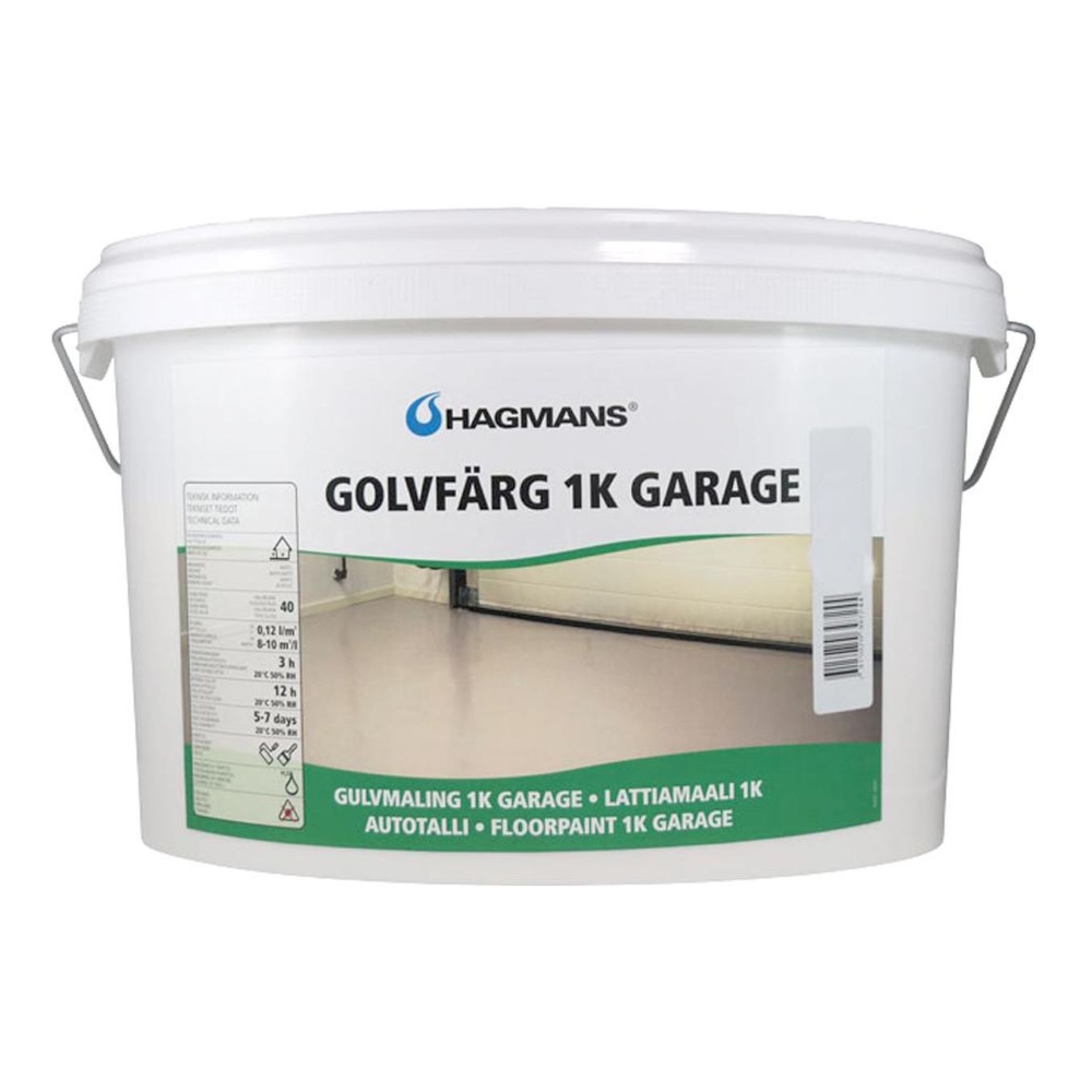 Hagmans Gulvmaling 1K Garage er en vandfortyndbar, en-komponent gulvmaling baseret på modificeret akrylat. Produktet er egnet til indendørs betonoverflader såsom garager og let industri. Ikke egnet til træ.