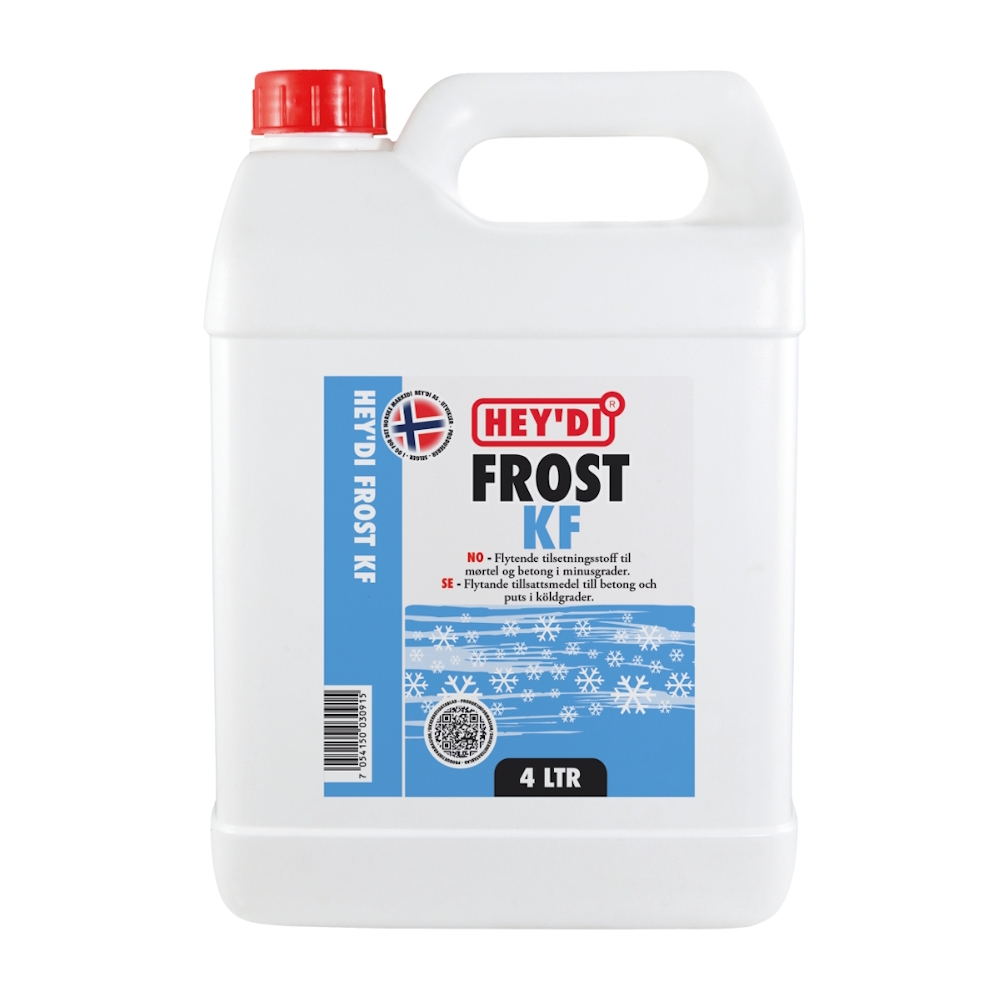 Flydende additiv, der sænker frysepunktet for beton og gips. Hey'di Frost KF er et flydende additiv, der sænker frysepunktet for beton og gips og muliggør murværk og støbning ned til -15 °C. Fungerer også som en accelerator og fremskynder hærdning.