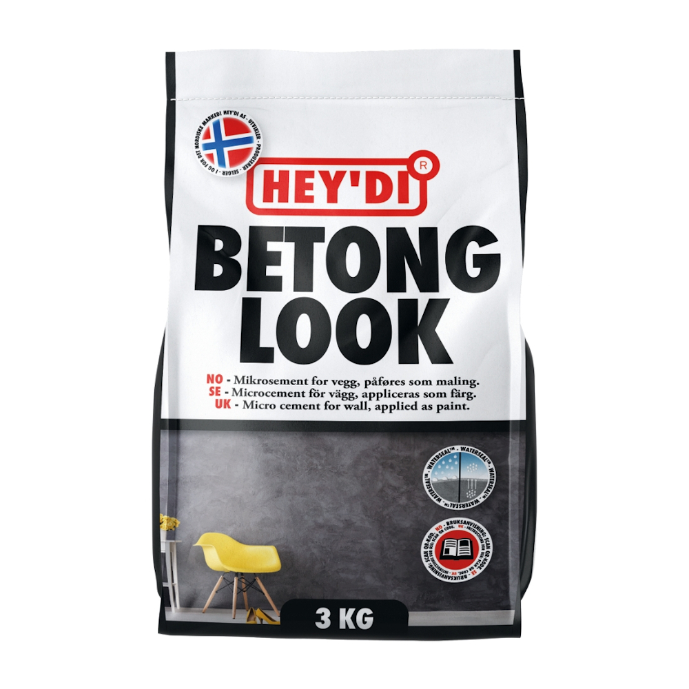 ConcreteLook til vægge. Et cementbaseret produkt, der påføres som maling. Produktet er fremstillet af hvid specialcement, hvid marmormel, stenmel og tilsætningsstoffer. Hey'di ConcreteLook blandes med vand og giver en overflade, der ligner støbt beton. Opbevaring: Opbevares tørt. Bedste brugsegenskaber inden for 2 år fra produktionsdatoen. Hey'di ConcreteLook kan bruges på vægge lavet af keramiske fliser, gipsplader, puds, mursten osv. Produktet er egnet til både indendørs og udendørs brug. Forbrug: 0,2-0,4 kilo pr. m² belægning.