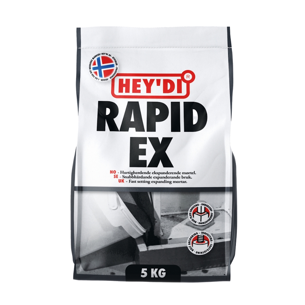 Hurtig hærdende, ekspanderende mørtel. Hey'di Rapid EX er en hurtigt hærdende, ekspanderende tørmørtel på cementbase til forankring og støbning af metalgenstande i beton og grundfjeld samt til understøbning af maskiner, skinner, søjler osv. Anvendes til understøbning, hvor beton ikke må krympe. F.eks. under en søjle eller under et husfundament, hvor man ikke ønsker at risikere sætninger i konstruktionen.