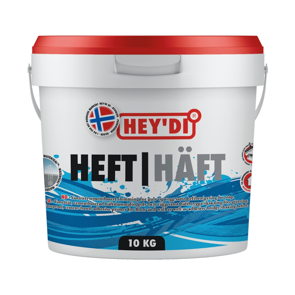 Hey'di Klæbemiddel er en vandtæt cementbaseret mørtel, der beskytter mod opstigende fugt fra gulvkonstruktioner og som vandtætning på vægge. Kan også bruges som klæbebro på cementbaserede underlag før nivellering eller støbning. Vandtæt cementbaseret klæbebro. Forhindrer fugttransport op fra underlaget.
