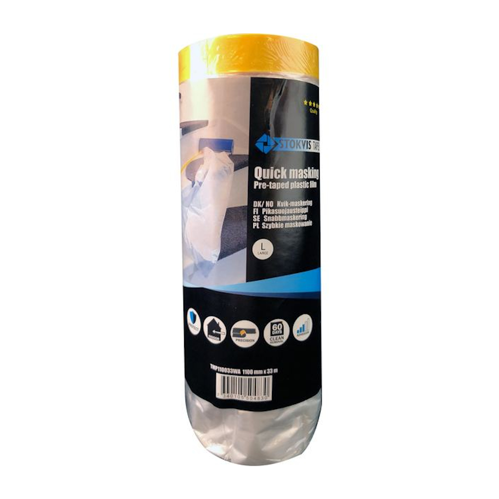 Beskyttelsesfilm leveret med UV-resistent gul rispapirtape. Gul tape er primært beregnet til indendørs brug - præcisionsafdækning. Kan forblive umalet i op til 60 dage. Plastfilmen er svagt statisk, hvilket betyder, at plastfilmen "trækkes mod" den overflade, der skal beskyttes. Det rigtige valg af højde/størrelse på plastfilmen giver god beskyttelse til f.eks. køkkenskabe eller andre genstande. Denne artikel kan beskytte møbler eller andet interiørdesign på en hurtig og nem måde. Der vil ikke være meget overskydende plastfilm, der kan være i vejen. Højden er tilpasset mindre overflader. Rullen kan også påføres i en praktisk dispenser, TMP20D. Beskytter alle typer overflader (vægge, møbler osv.) mod eksponering for maling, stænk eller andet snavs.