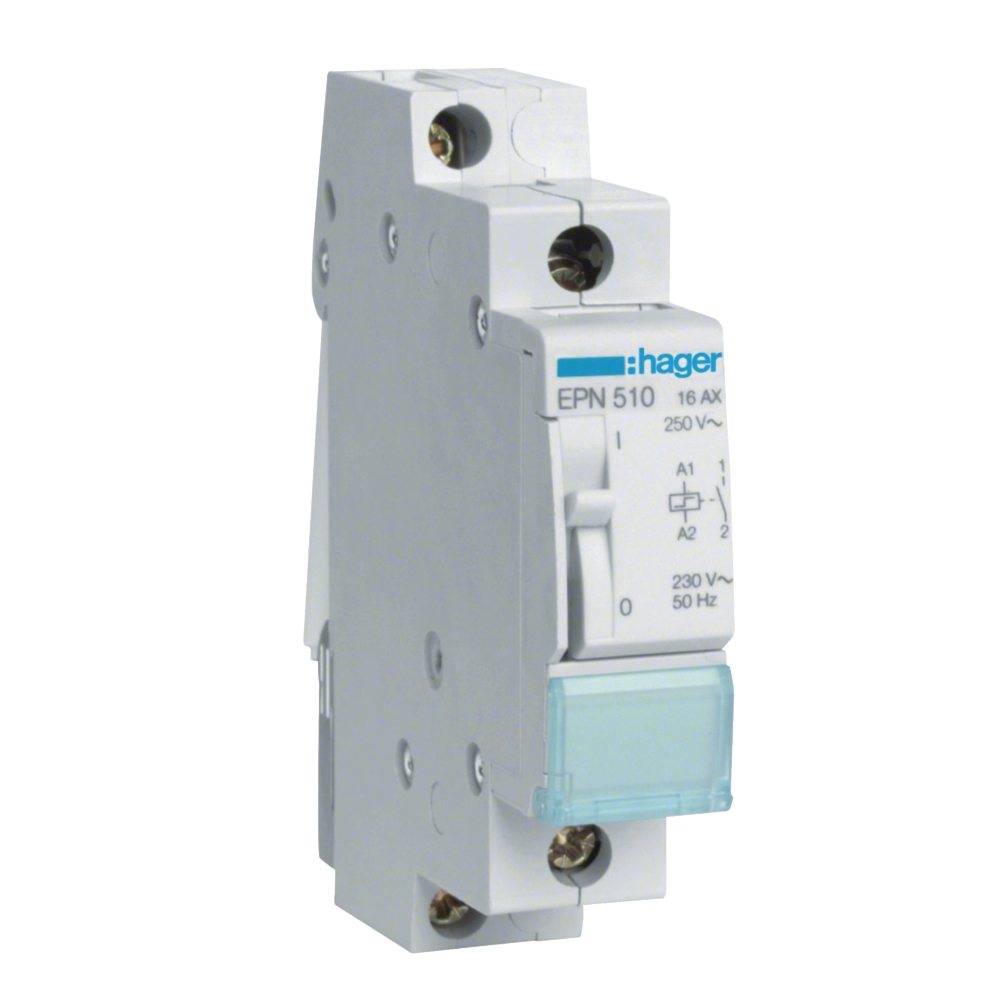 Impulsrelæ EPN510 med nominel strøm 16A og med spolespænding 230V i én modulbredde. Impulsrelæet har en normalt åben (NO) kontakt. Impulsrelæ kaldes også bistabilt relæ. Styres via puls fra f.eks. trykknap. Til mindre belastninger såsom belysning osv. Udstyret med positionsangivelse og håndafbryder.