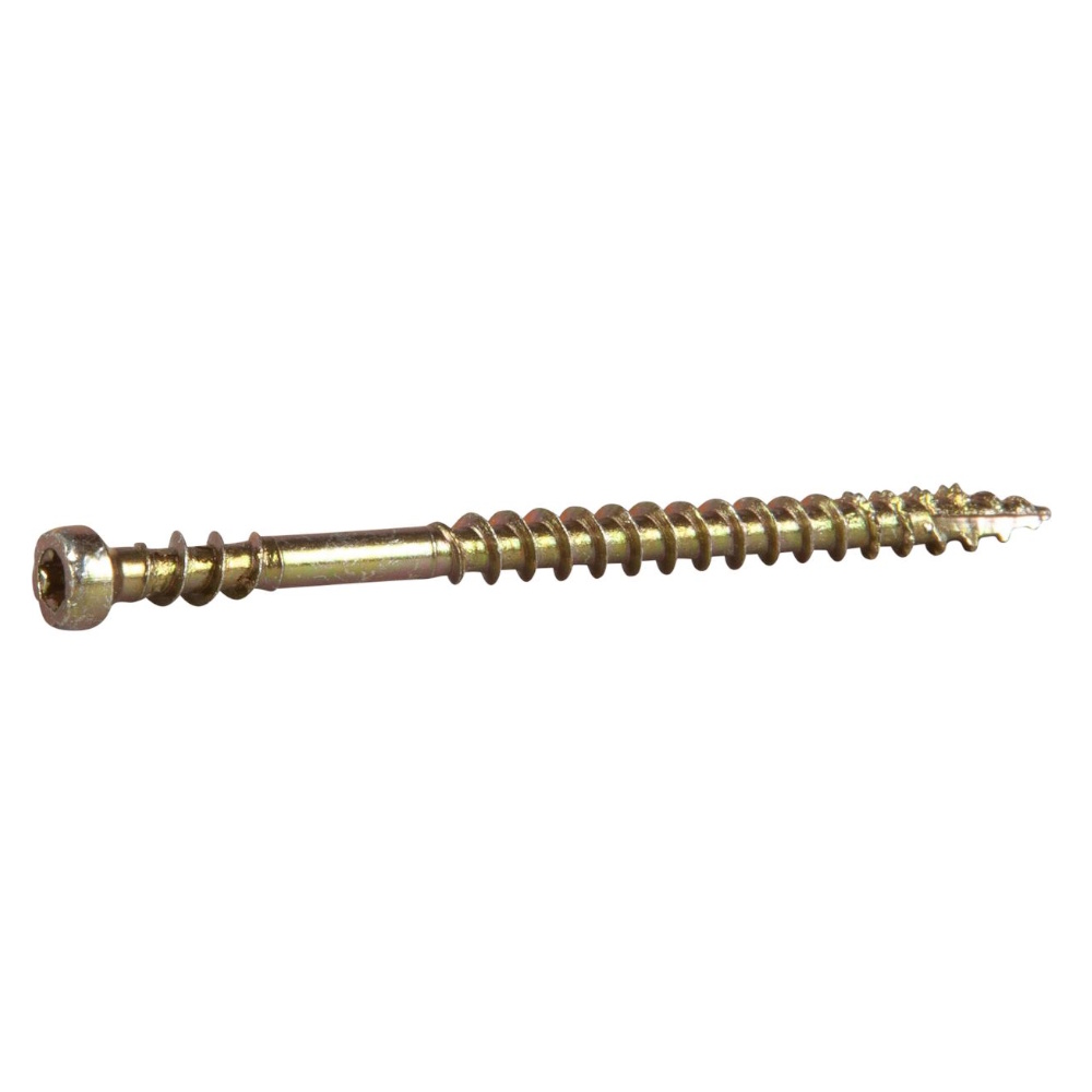 Skruen er lavet af hærdet stål, med gulkromateret overfladebehandling og gulkromateret med hvid maling.