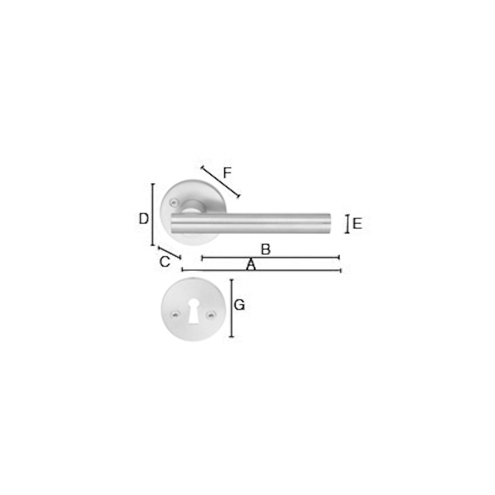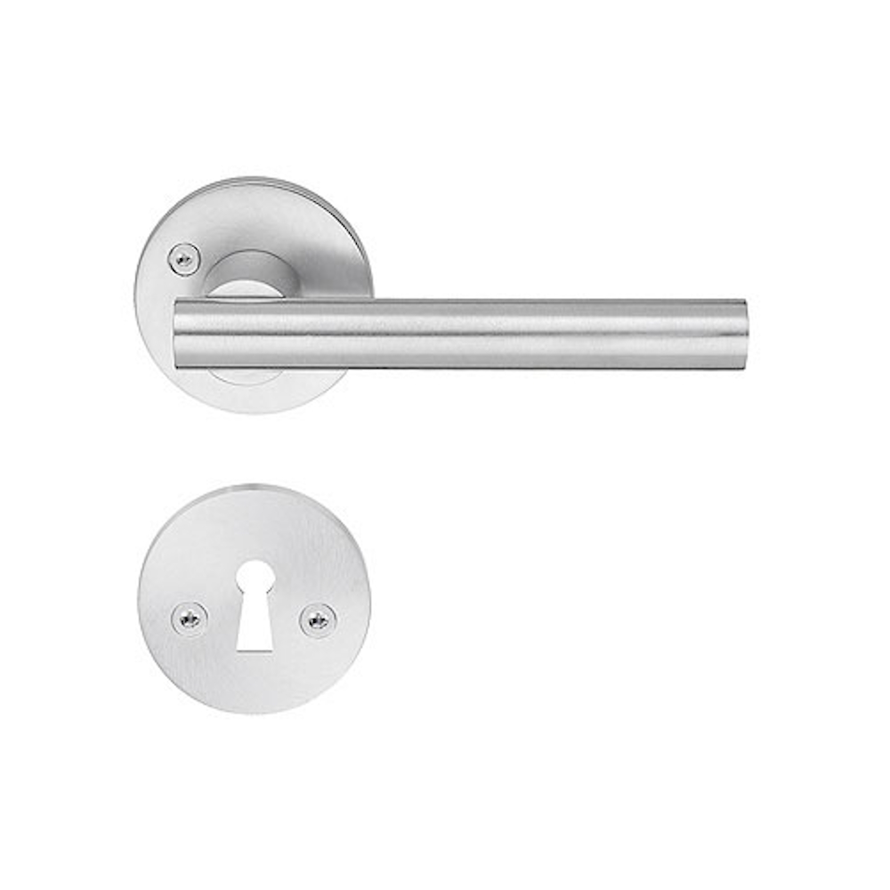 Indvendige dørhåndtag og nøgleskilte med et moderne look, stilfuldt håndtag med et slankt design og en mat overflade i børstet krom.