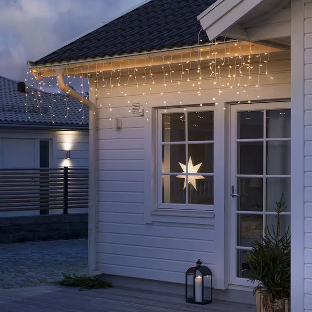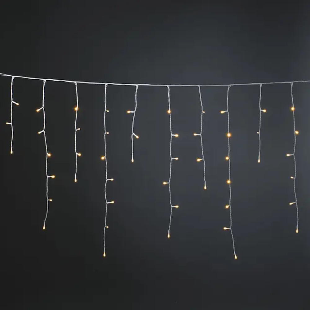 Istapstreng med 200 frostede ravfarvede LED-lys. Ophængningshøjde mellem 30-70 cm. Forbindelseskablet er 10 meter langt, hvilket giver en samlet længde på 15,07 meter.