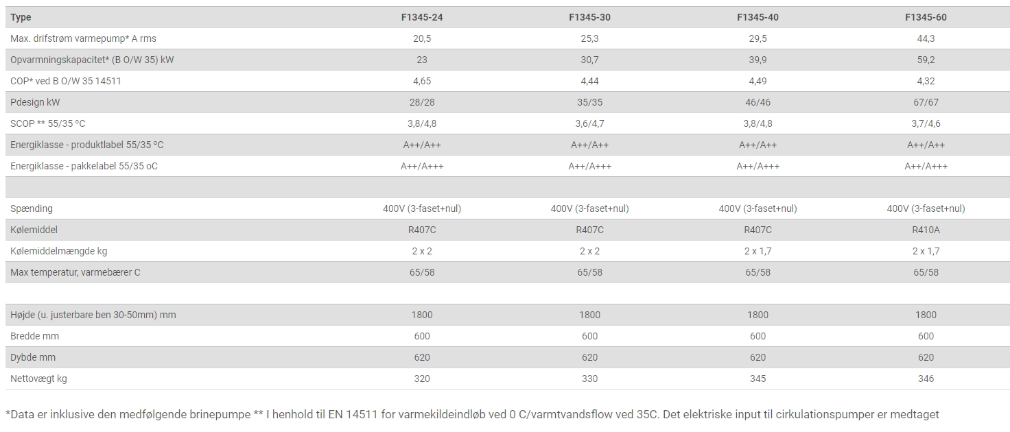 NIBE F1345 er en kraftfuld og fleksibel jordvarmepumpe, der fås i effektstørrelser 24, 30, 40 og 60 kW. Energiklass A2 +