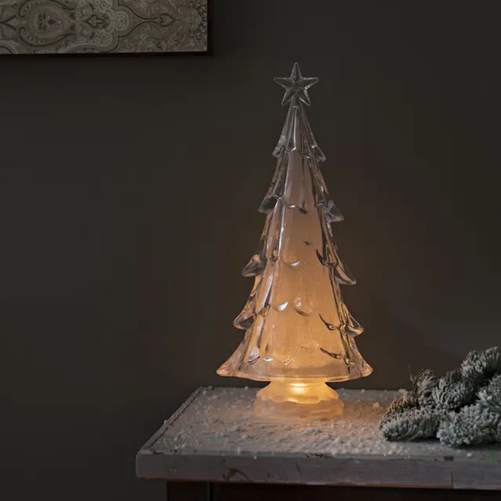 Elegant juletræ i islignende akrylplast, der roterer og spreder et atmosfærisk LED-lys. En dekorativ borddekoration, der fanger lyset på en magisk måde og skaber en vidunderlig julestemning i hjemmet. Drevet af 3xAA-batterier (medfølger ikke).