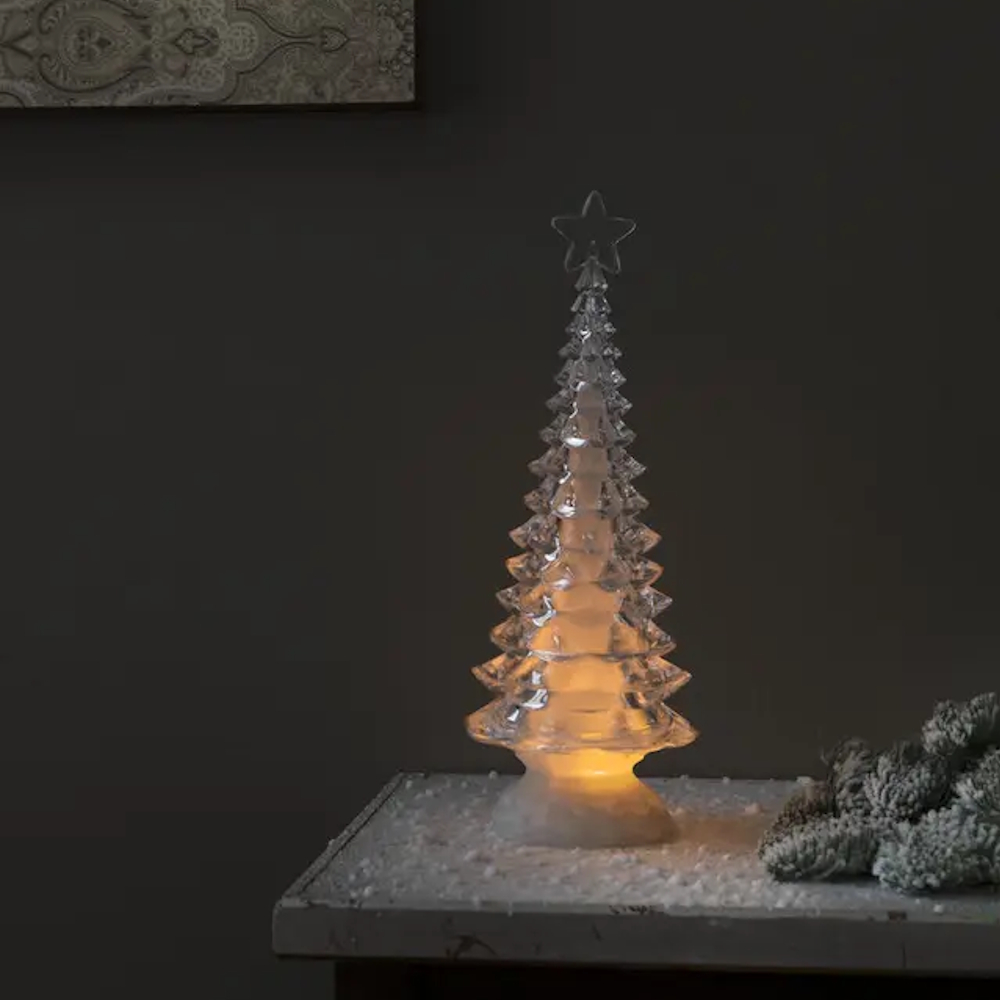 Elegant juletræ i islignende akrylplast, der roterer og spreder et atmosfærisk LED-lys. En dekorativ borddekoration, der fanger lyset på en magisk måde og skaber en vidunderlig julestemning i hjemmet. Drevet af 3xAA-batterier (medfølger ikke).