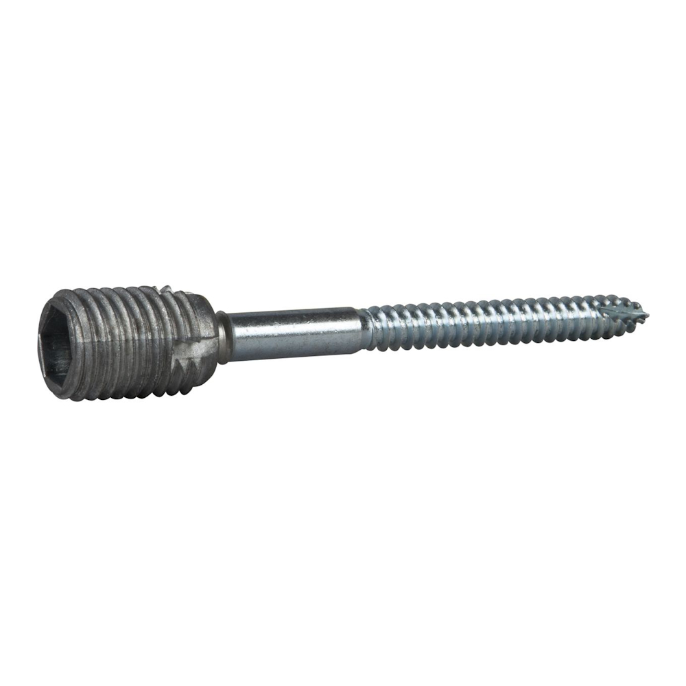 Essve Programa Plus Karmskrue består af en udvendigt gevindskåret zinkmuffe og en gennemgående stålskrue, der kan rotere frit i muffen.