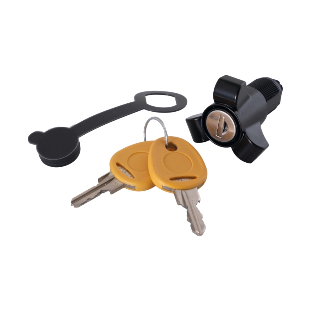 - Lås, 2 nøgler, vejrtætning og skive/møtrik til bolten.