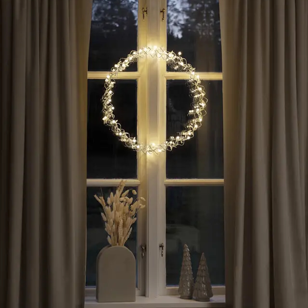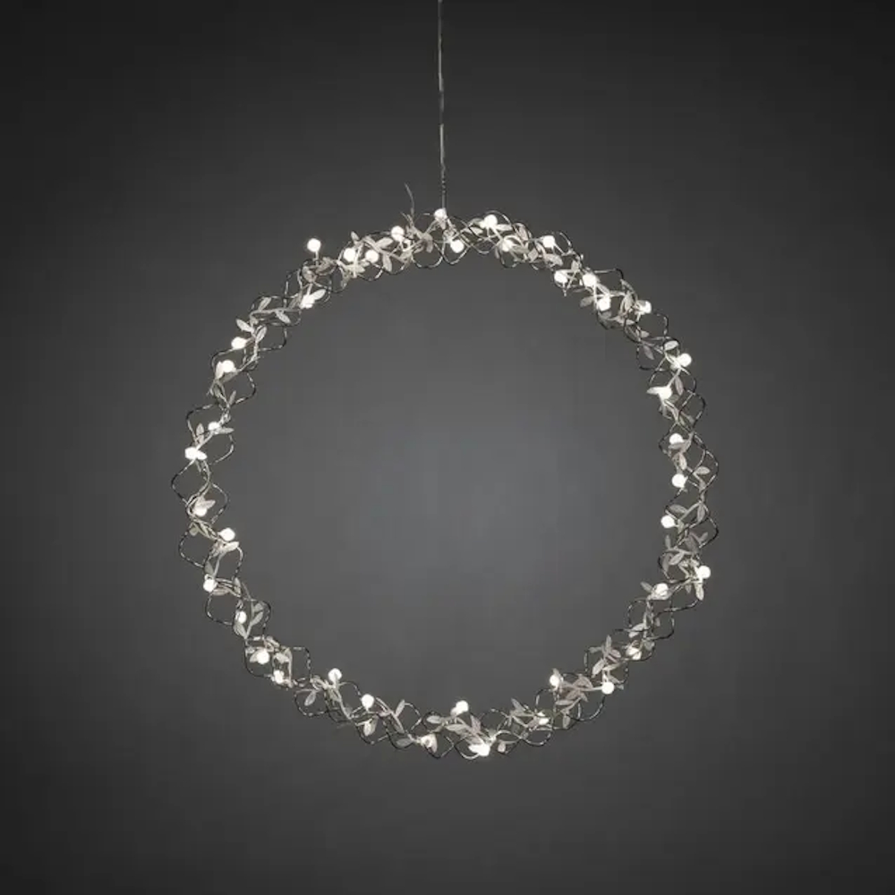 Dekorativ krans i sølvfarvet stål med 40 varmhvide LED-lys til indendørs brug. Drevet af 4,5V transformer. Diameter 45cm.