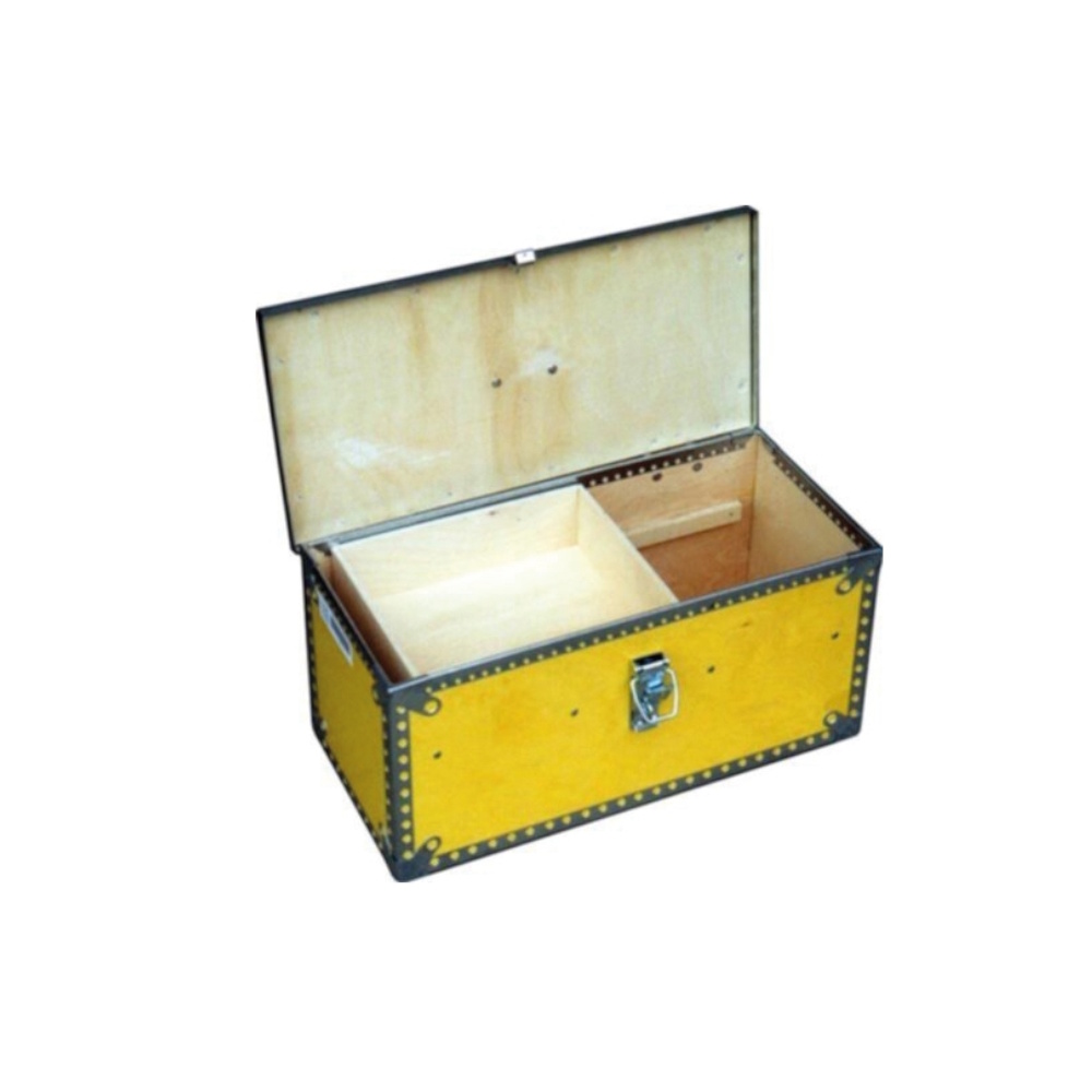 Værktøjskasse med løs skydeindsats. Lavet af gulbejdset og UV-lakeret vandtæt birkekrydsfiner. Monteret med galvaniserede stålbeslag på alle kanter og hjørner. Forstærket låg med galvaniseret vinkeljernsramme, hvorpå hængsler og låse er monteret. Excentrisk lås er monteret med sikkerhedshasp. Kan også aflåses med hængelås.